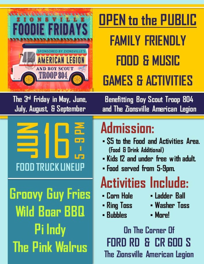 Come out and support troop 804 in their fundraising efforts through this great event. Zionsville Foodie Friday at the Zionsville American Legion Post.