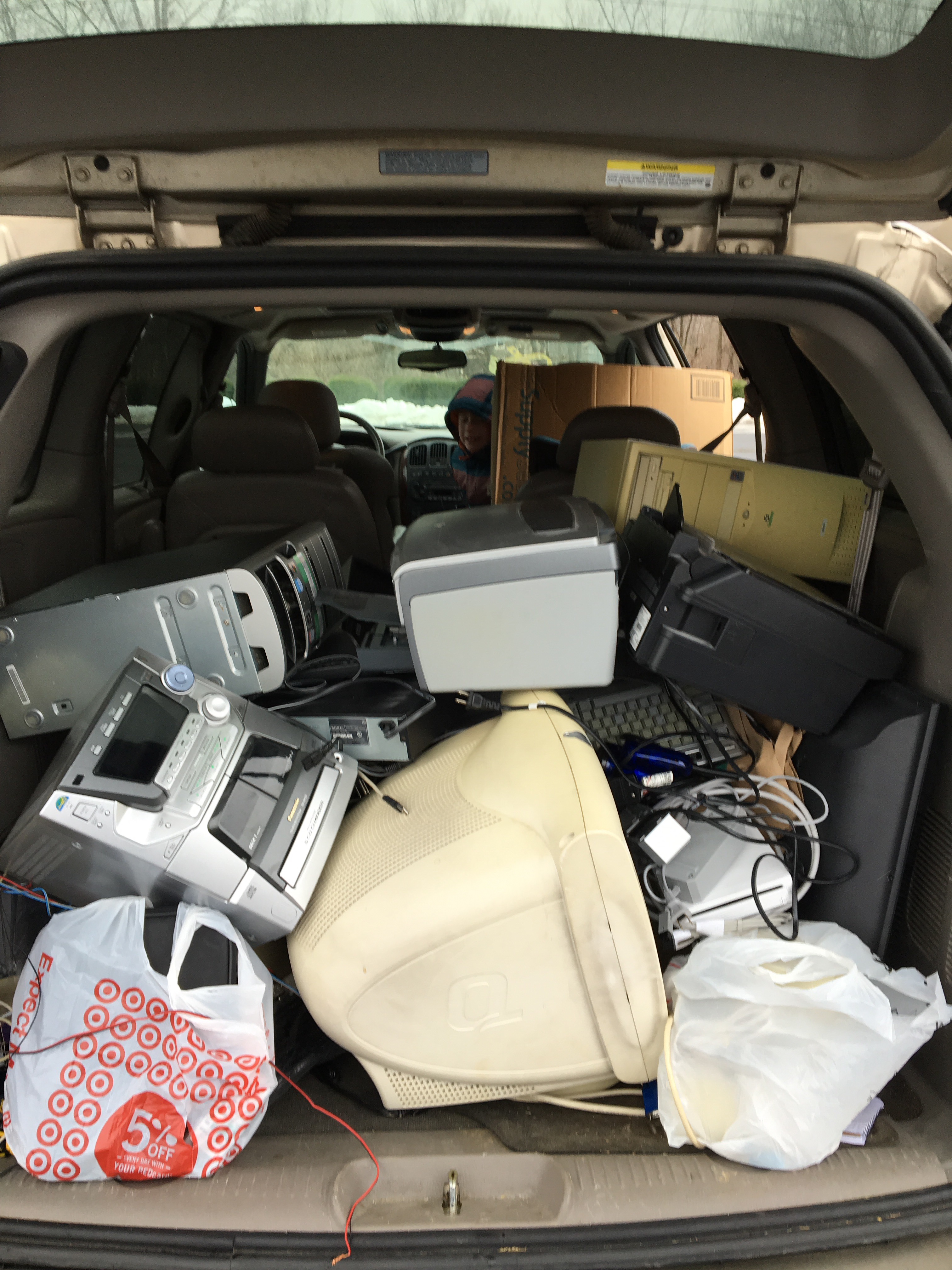 During the e-cycle drive we collected all sorts of old computers, printers, ipods, stereos, phones and TV’s. The large tube TV’s were taken to St Luke’s Church and donated so that they can be fixed if needed and given to families who are less fortunate. I am very proud of these boys, their parents and our community for coming out and supporting the environment and Scouts. Wahoo!